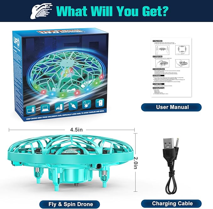 - Included Components : User Manual, charging cable, flying drone toy