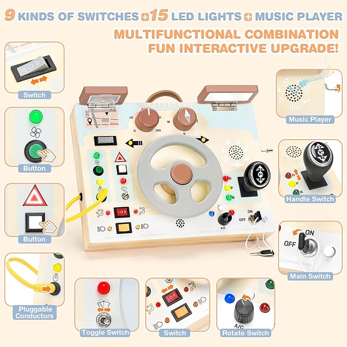 - 【Car-Themed Interactive Fun & Creativity Stimulation】This busy board is themed around car driving, combining 9 switches, 15 LED lights, a music player, and simulated driving functions. The montessori busy board features a rotating steering wheel that makes sounds and an operable gearshift lever. The busy boards can develops children's imagination, sensory perception, and hand-eye coordination, allowing them to explore the world of transportation through fun and interactive play. Requires 3*AA batteries (not included).