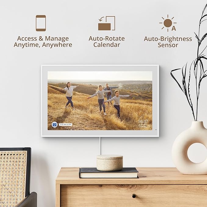 - 【Charming Digital Picture Frame】: When not in use, your smart calendar transforms into a beautiful digital picture frame. Showcase treasured family photos on the crystal-clear 21.5" large touchscreen, adding a touch of elegance to any room as modern home decor.