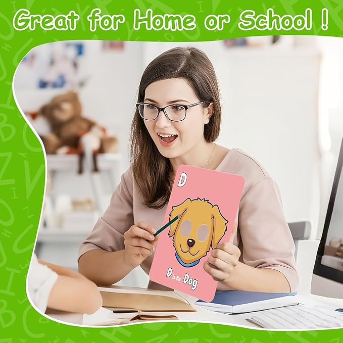- 【 Fun Cards】 This set includes 26 oversized letter cards, 7 inches by 8.6 inches, from A to Z. Each card has a fun cartoon character and bright colors to help learn uppercase and lowercase letters, spelling, and recognizing animals