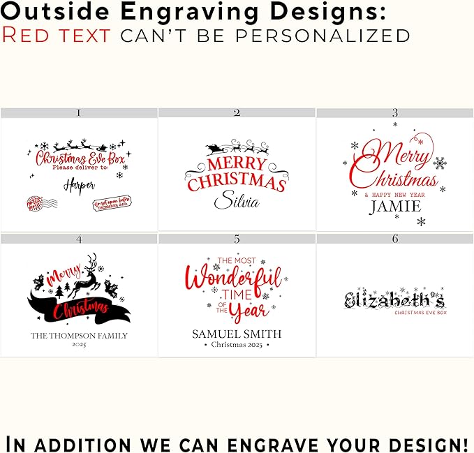 - Personalized: This Christmas eve box can be engraved with designs we offered adding the child's name, names, family name, year to make it unique. We’ll use the font style showcased in the photos. Additionally, it can be engraved inside, on the other lid's side, to create a surprise message for the recipient. Different font options for inside engraving.