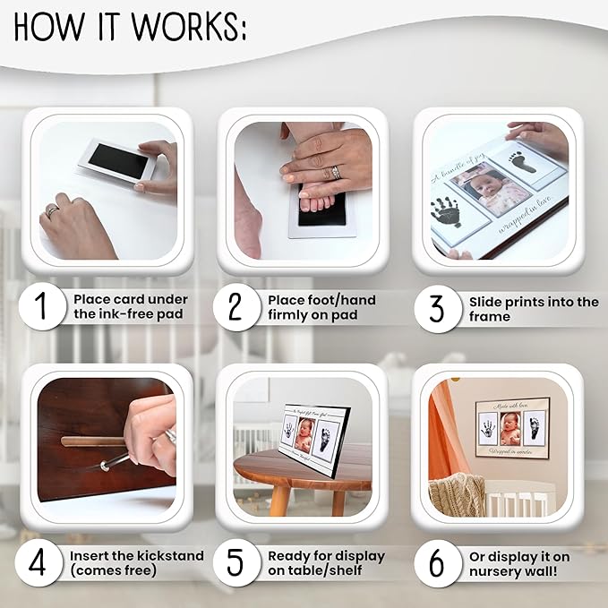 - NO HASSLE, NO MESS BABY KEEPSAKE - With lovely designs you can choose from, built-in acrylic cards to insert the prints to, a printed photo of your baby, no-mess inkpads for baby hand and footprints, this is the easiest way to capture your baby’s adorable prints forever. It comes with 4 print cards and 4 safe, no-mess ink pads, so you can try to get the perfect print more than once!